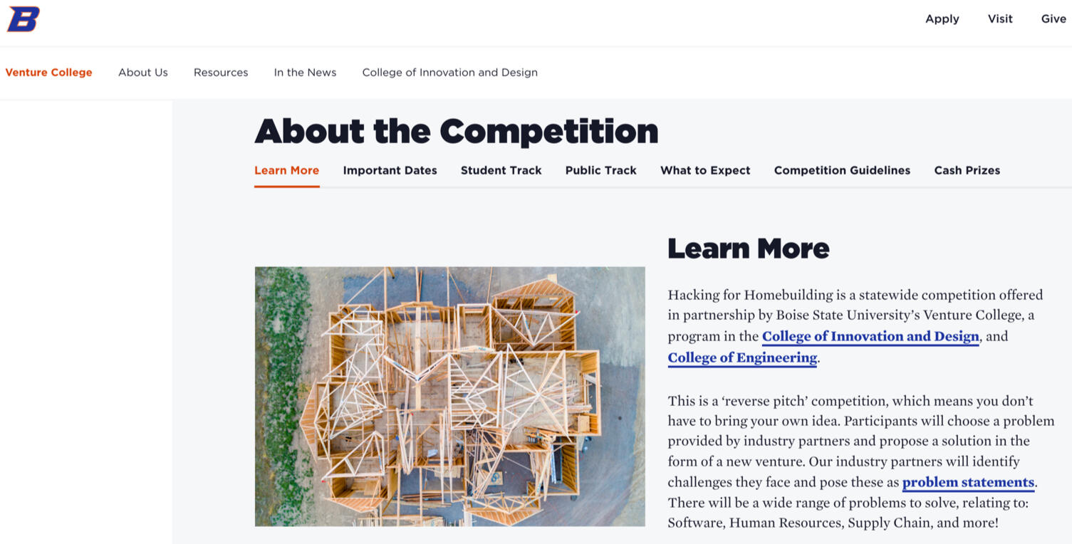 Starting in the fall of 2020, we began this journey by launching a reverse pitch competition called Hacking for Homebuilding awarding students and the general public for the best solutions to problems put forth by companies tied to the home building industry. Now in our third year, the 2022 event is poised to be bigger and better than ever.In collaboration with the Boise State Venture College, Boise Entrepreneurship Week and other universities and organizations across Idaho, the pitch competition events have established a launch pad for this next phase where we are adding supplemental events and expanding our scope to engage a national audience.